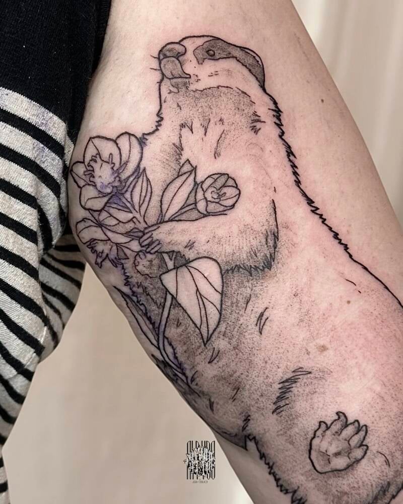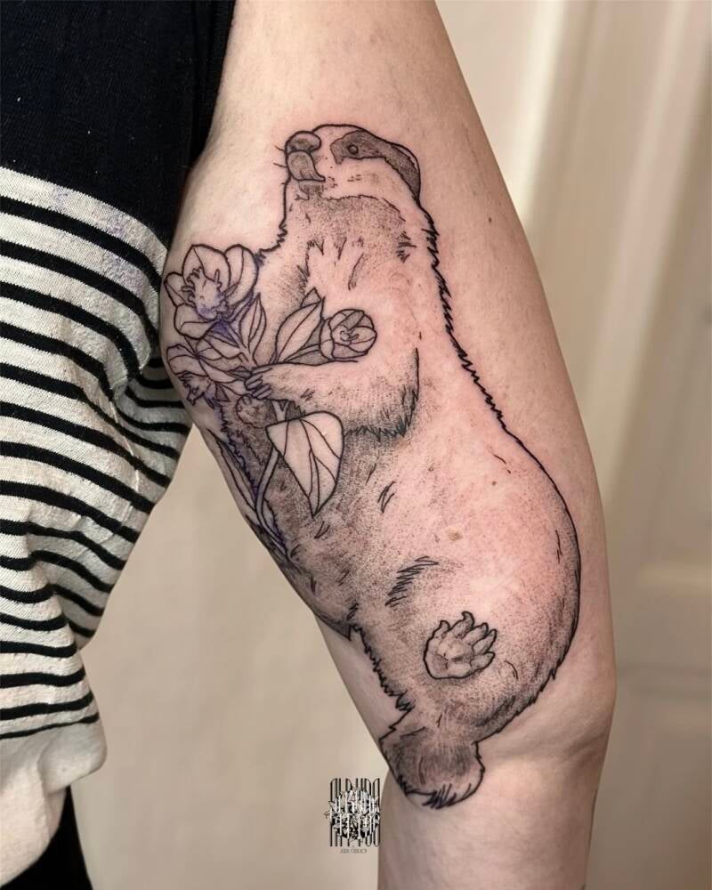 06.05.25 Dieser süße Dachs mit Schneerosen durfte ich als Ergänzung zum Eichhörnchen mit Himbeeren tätowieren.