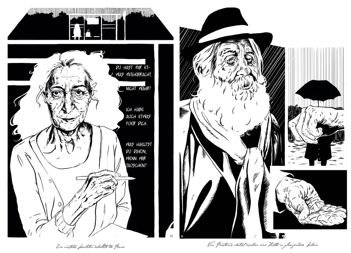 In meiner Diplomarbeit setzte ich mich mit diesen Themen künstlerisch auseinander. Ziel meiner Arbeit war das Erstellen einer zeichnerisch umgesetzten Kurzgeschichte.